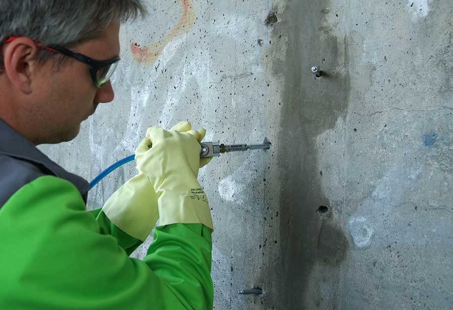 Fixing nozles within the cracked area using rapid setting cement Greenseal Flash Set / crystalline based cementitious grout Greenseal Injection Grout. Pressure grout high strength, low shrinkage crystalline based, cementitious grout Greenseal Injection Grout till the nozle is thoroughly filled.